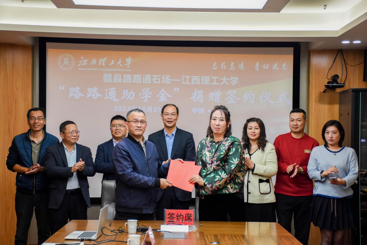 与赣县路路通石场举行“路路通助学金”捐赠签约仪式并召开座谈会。签约仪式在三江校区濂溪楼4号会议室进行,校党委常委、副校长、教育基金会副理事长廖春发,校国内合作促进中心主任、教育基金会副理事长兼秘书长许洪胤,材料科学与工程学院院长刘柏雄等校方代表,赣县路路通石场总经理高丽等企业代表参加相关活动。活动由材料科学与工程学院党委副书记丁能文主持。