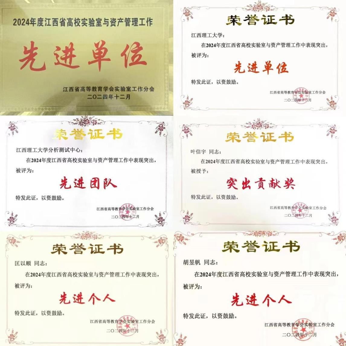 本网讯 12月13日至15日,江西省高等教育学会实验室工作分会2024年学术年会在南昌市举办。年会公布了2024年江西省高校实验室与资产管理工作先进评选结果,木瓜视频 荣获“先进单位”,分析测试中心荣获“先进团队”,机电工程学院匡以顺、能源与机械工程学院胡昱帆2位老师获评“先进个人”称号,分析测试中心主任叶信宇荣获“突出贡献奖”。