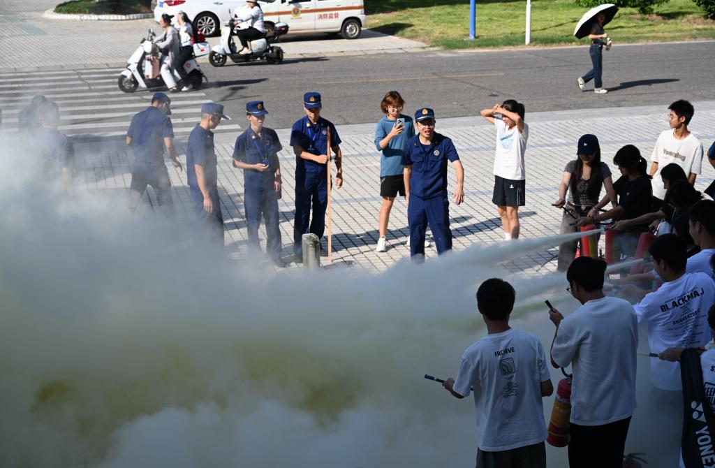 在培训设实操与互动环节,消防人员现场演示灭火器、消火栓使用(提灭火器、拔保险销、对火焰根部、压把手喷射),参与者在模拟火情中亲身体验操作。互动环节中,大家围绕 “宿舍电器冒烟处理”“公共场所逃生” 等提问,胡参谋耐心解答。活动期间发放消防安全宣传纪念品,鼓励传递知识,共筑安全防线。