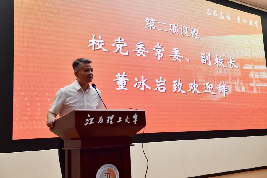 董冰岩代表学校致欢迎辞。他从综合实力大幅提升、学科建设成效显著、人才培养提质增效、高端人才实现突破、科技创新硕果累累、服务社会贡献凸显等方面介绍了学校发展取得的成绩。他表示,学校今天的成绩今日成就的取得,得益于每一位校友的拼搏、与奋进及、支持与关爱,学校正朝着“创建稀土及关键矿产领域世界一流大学”的目标迈进,希望广大校友持续关心,聚力赋能,携手共创江理美好明天。